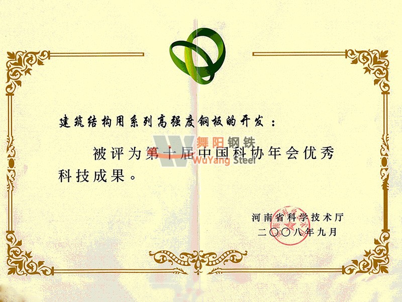 舞陽鋼鐵公司-建筑結(jié)構(gòu)用系列高強(qiáng)度鋼板的開發(fā)被評為第十屆中國科協(xié)年會優(yōu)秀科技成果